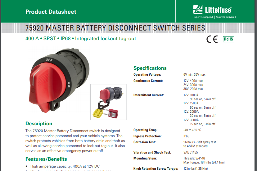 The system draws over 300A steady when at full throttle. The switch being used is one of the few out there that can handle that current in any reasonable form factor. If you pay very close attention to the quality of your joints and minimize your wire lengths you should be ok with the current switch. We are continuing to search for alternatives.