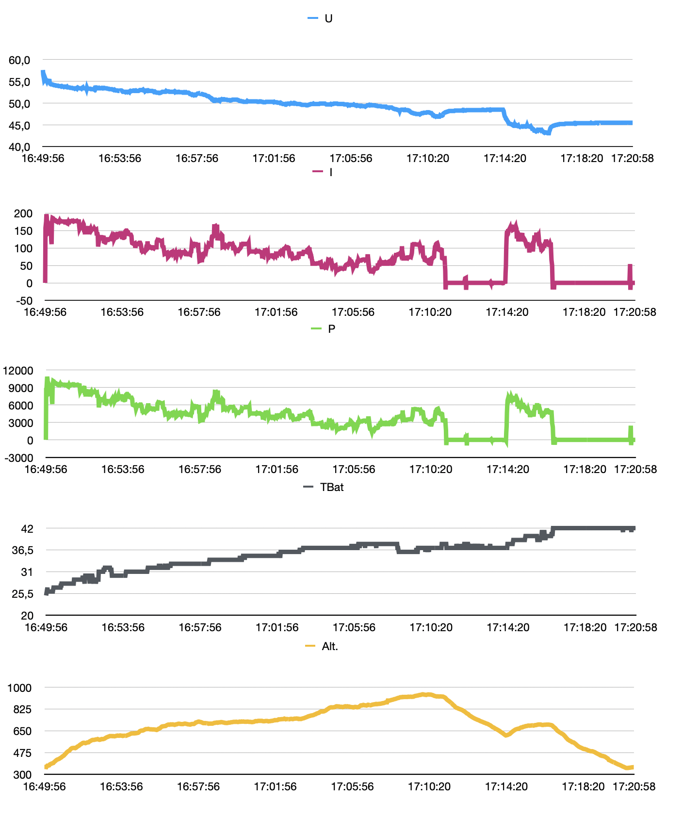 Today I had two flights, one with the 14s5p (Molicel p45B) and then with the 14s8p (BAK 45D). In both flights I was using a 2-liner wing and climbed from 350 m up to 1000 m (partialy with thermal support). With the 8p battery the motor running time was 23 min and the lowest voltage was at 43.1 V. Directly before take off it was 57.6 V.